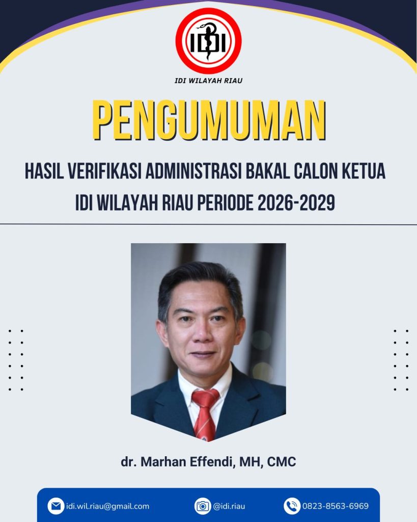 Kami mengucapkan selamat kepada para Bakal Calon yang telah lolos tahapan verifikasi administrasi. Kepada seluruh Sejawat anggota IDI Wilayah Riau, mari kita kawal bersama proses demokrasi profesi ini agar berjalan dengan lancar, tertib, dan membawa kemajuan bagi organisasi kita tercinta.