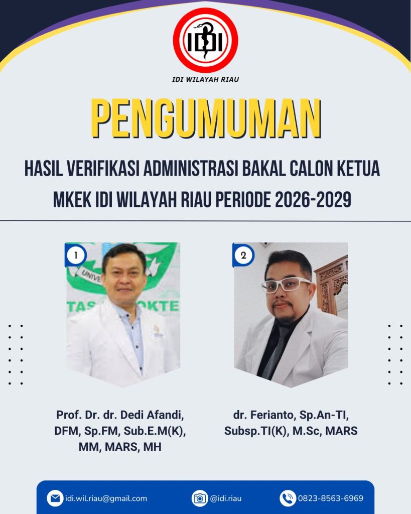 Berdasarkan hasil rapat dan pemeriksaan berkas kelengkapan, Tim Seleksi dengan ini mengumumkan nama-nama Bakal Calon Ketua IDI Wilayah Riau, Majelis Kehormatan Etik Kedokteran (MKEK), dan Majelis Pengembangan Pelayanan Keprofesian (MPPK) Periode 2026-2029 yang dinyatakan lulus verifikasi administrasi. Berikut adalah daftar nama Bakal Calon yang telah ditetapkan: